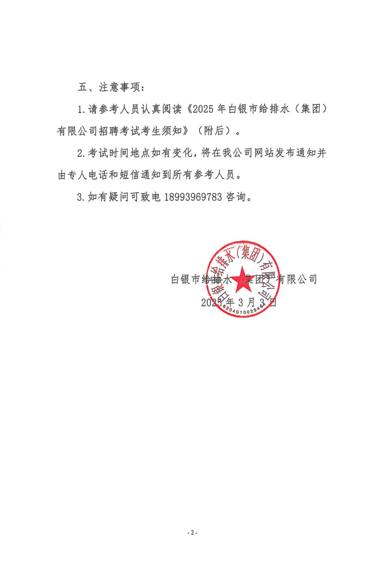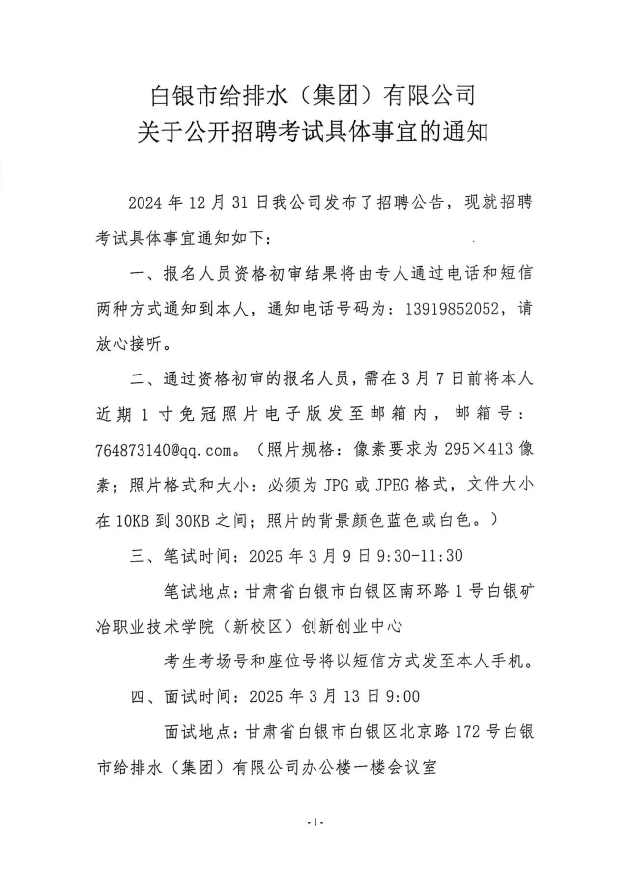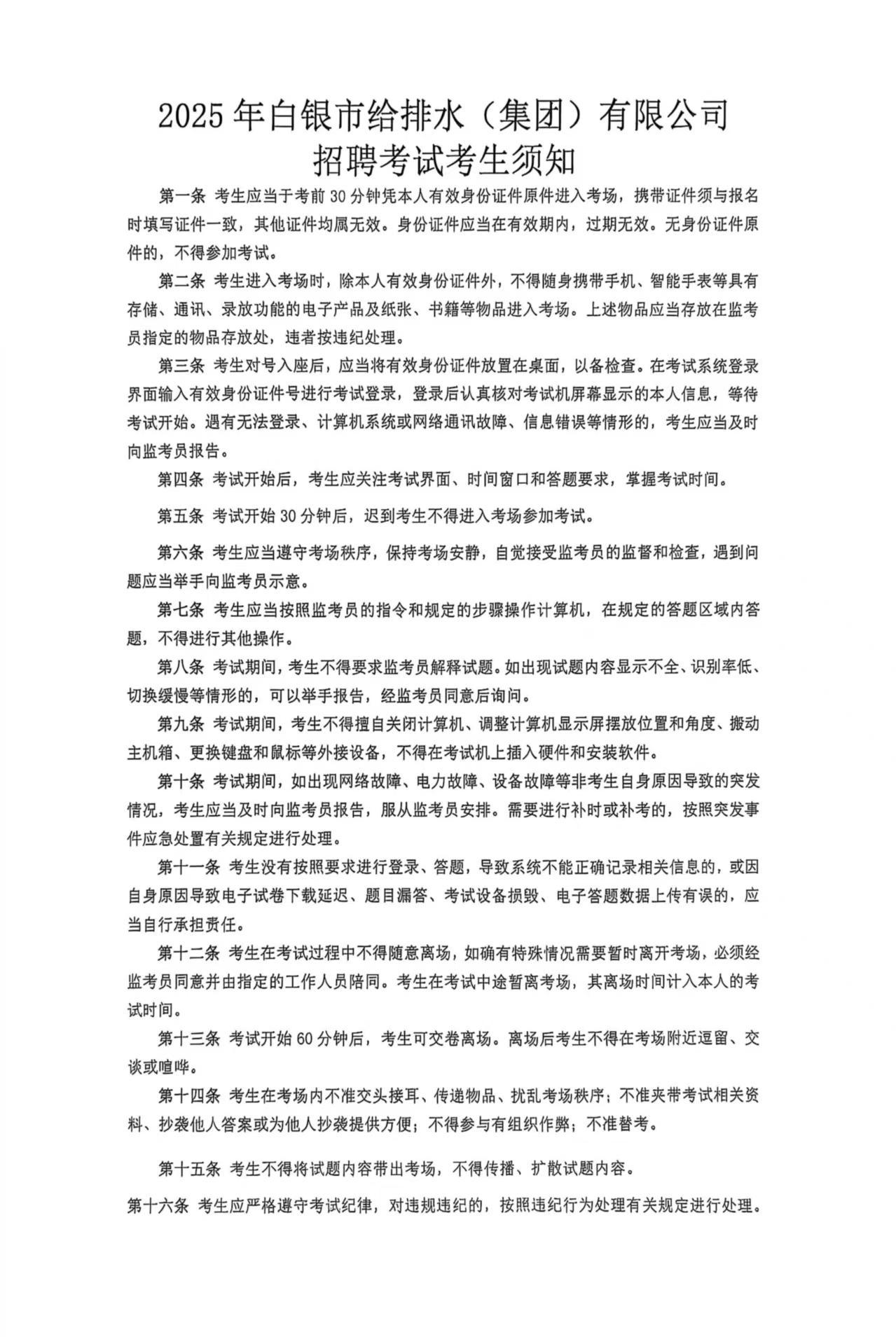 白銀市給排水(集團(tuán))有限公司關(guān)于公開招聘考試具體事宜的通知