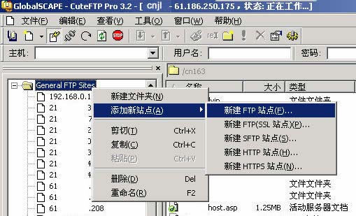 ★打開(kāi)Cuteftp Pro,點(diǎn)擊左邊窗口"站點(diǎn)管理器",右擊"General FTP Sites"(如圖1),在出現(xiàn)的菜單中選擇"添加新站點(diǎn)"-->"新建FTP站點(diǎn)"。
